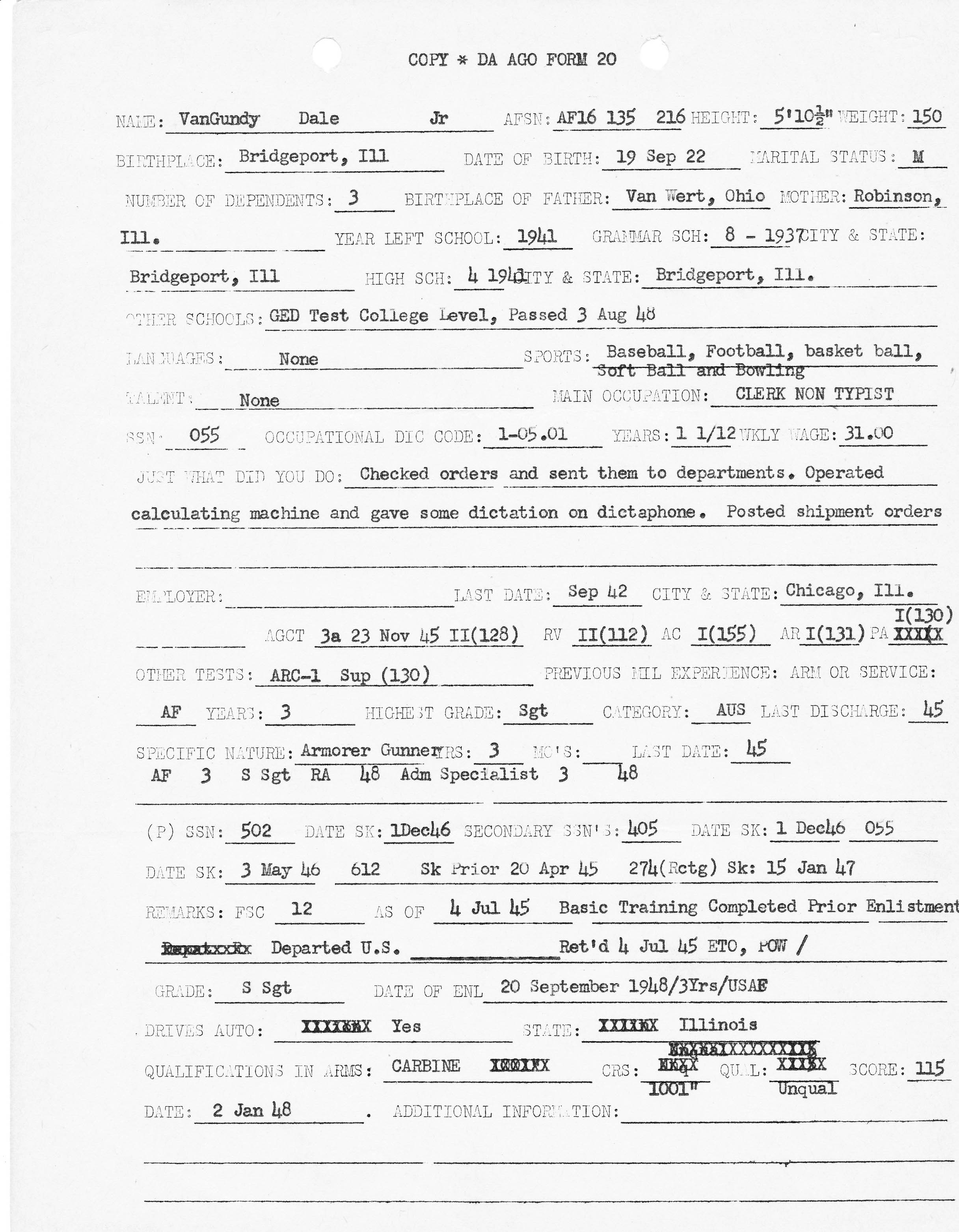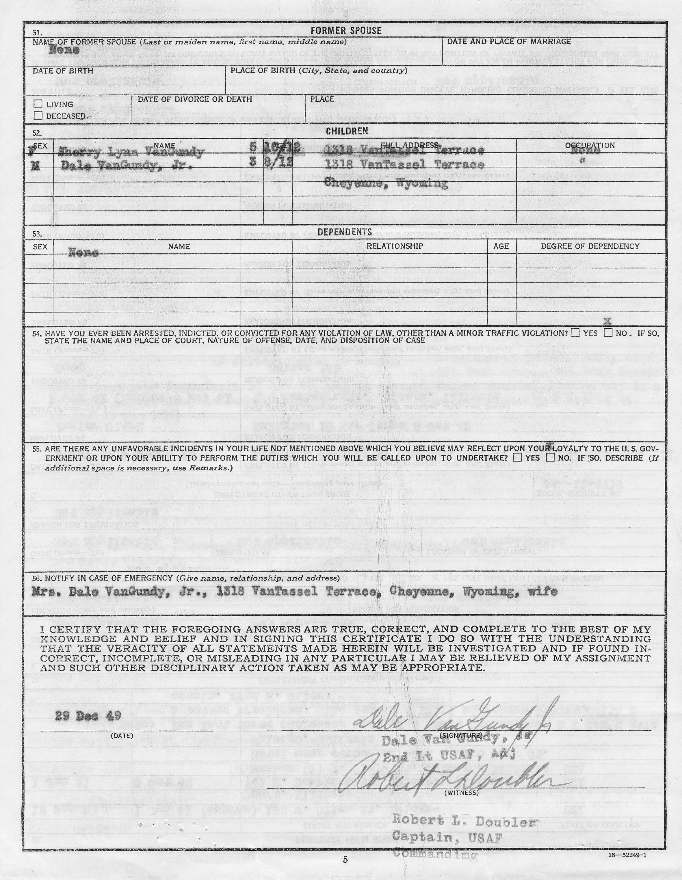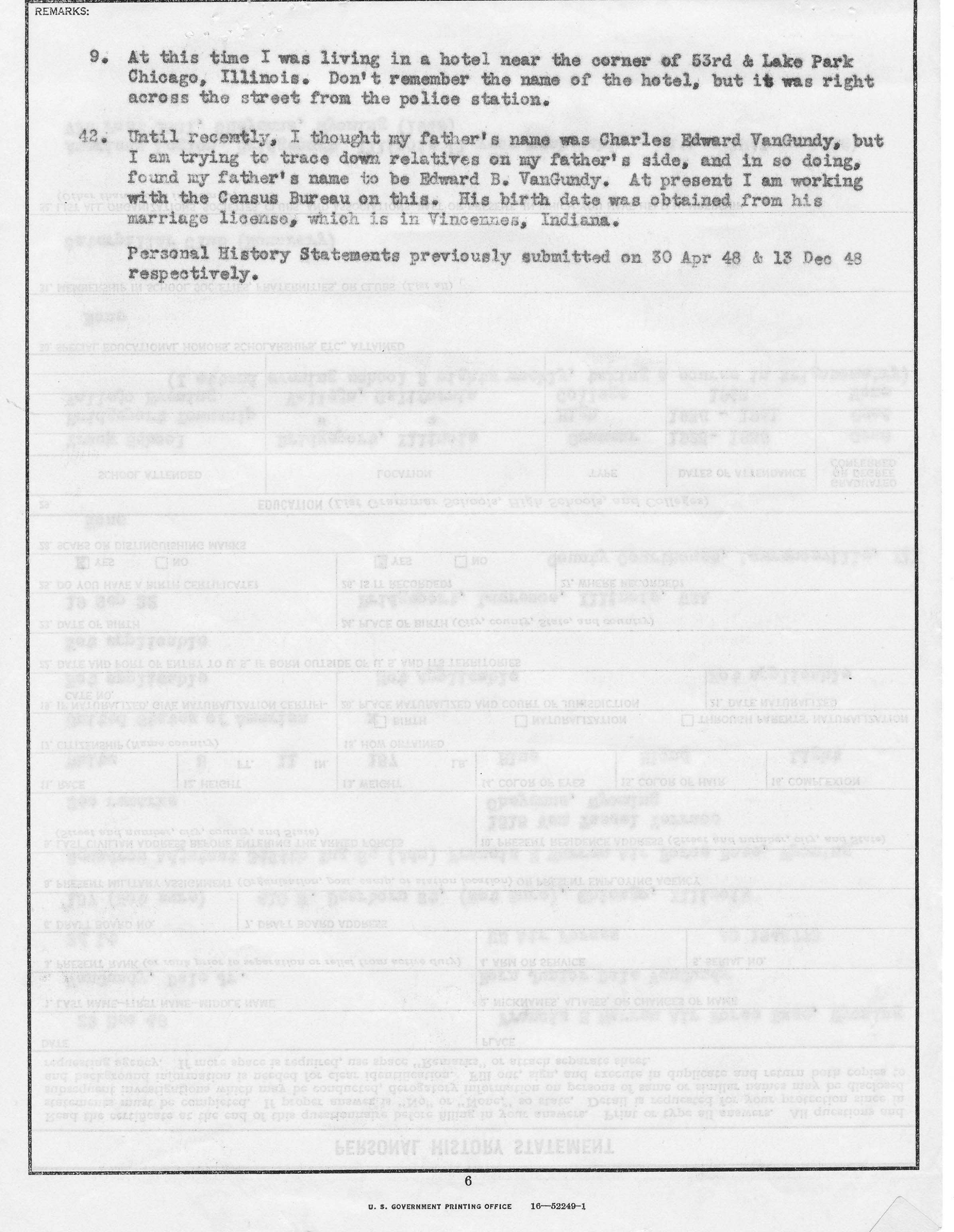 The following six images are Dale Van Gundy's Personal History filled out in 1949 after his was discharged as an enlisted man and prior to him be sworn in as an officer.